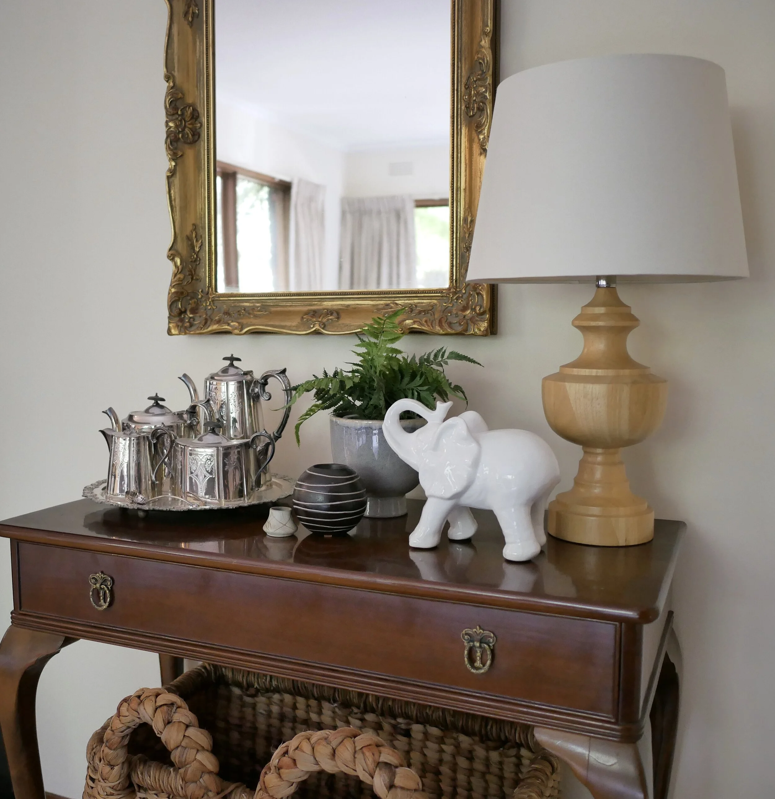 Treasures collected and handed down through generations are proudly displayed in this lounge room. Silverware, ceramics and old candlesticks with stories are casually displayed to make them accessible. Memories of family times and special occasions are celebrated. While some stories are known, others remain a mystery such as the origin of the unusual geometric side tables. More contemporary items such as the sofa, mirror and coffee table help balance the items from looking too precious and showcase the treasured items.